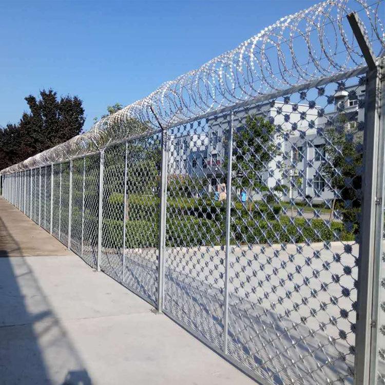V型支架立拄,加強型焊接片網,安全防盜連接件和熱鍍鋅刀片刺籠組成。客戶要詳細說明這些組件的材質、規格,例如監獄隔離網的刀片刺網是采購不銹鋼304材質刀片刺網還是鍍鋅材質刀片刺網。v網是否折彎或者增加加強筋,有的客戶為了造價低廉也選擇不用V網,而是在Y形柱上焊接刺繩勾,直接把刀片刺繩掛在立柱上,用4根3mm左右鍍鋅絲加固。