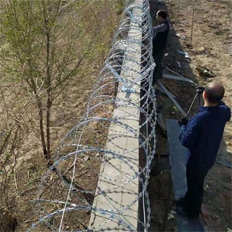 刀刺隔離網不僅能夠單獨的使用,還能與其他產品搭配來使用,而且搭配使用比單獨使用所起到的防護作用要提高不知多少倍,尤其是在圍墻上應用。刀刺隔離網本身就有著不下于其他產品的防護性能,如果加上圍墻本身的高度和防護性能的話,效果更是非常厲害,畢竟僅僅是圍墻的話所起到的防護效果也就是高度高點很難令人攀爬,但不是怕不上去,而如果加上刀刺隔離網這種令人看了就心驚膽戰的產品的話,安全系數可謂是相當的高,即使圍墻不是很高也不會出現小偷翻墻進來的情況。