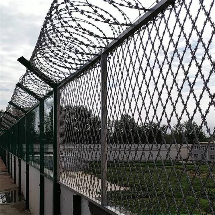 監獄隔離網經過編焊而成;網格結構簡練、便于運輸、安裝不受地形起伏限制,特別是對于山地、坡地、多彎地帶適應性極強。監獄隔離網的主要特點是網身高大,防攀爬能力強,抗沖擊,表面雙層優質防腐處理,可達到10年的超長壽命, -經推出,就得到了各大機場的高度認可,監獄隔離網是由V型支架立拄,加強型焊接片網,安全防盜連接件和熱鍍鋅刀片剌籠組成是強度和安全防御性級別很高的防護安全。注:如果在監獄隔離網頂部加裝刀片刺絲、刀片剌繩后又很好的增強了安全防護性能。