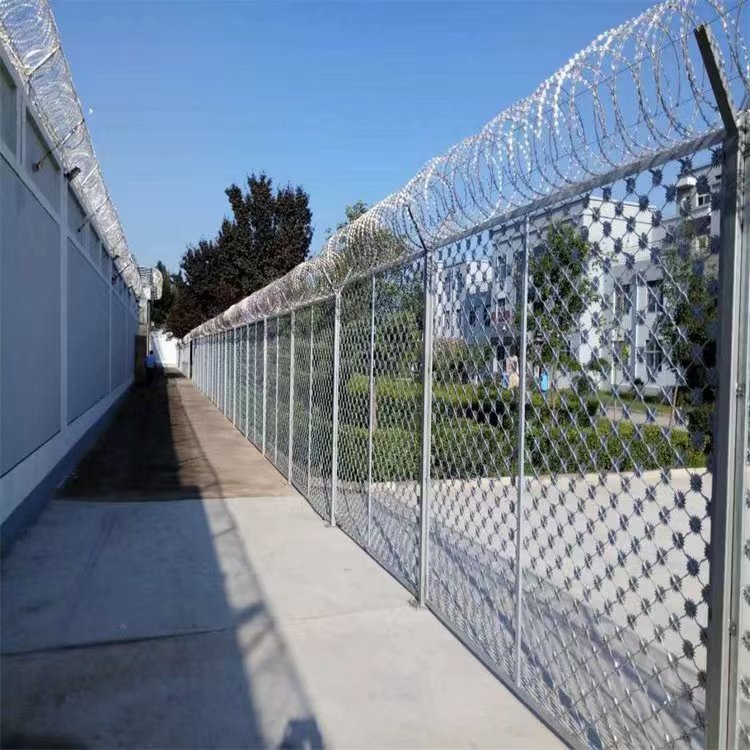 監(jiān)獄隔離網(wǎng)是由網(wǎng)片、 Y型立柱和刀刺組成的,立柱與網(wǎng)片采用邊耳連接或防盜螺絲貫穿連接。第三種是近年來(lái)新出的梅花剌隔離網(wǎng),隔離網(wǎng)的網(wǎng)片是菱形孔的美格網(wǎng),在每個(gè)鋼絲相連接的焊點(diǎn)_上焊接梅花刺片,刺片鋒利,也就無(wú)法攀越。