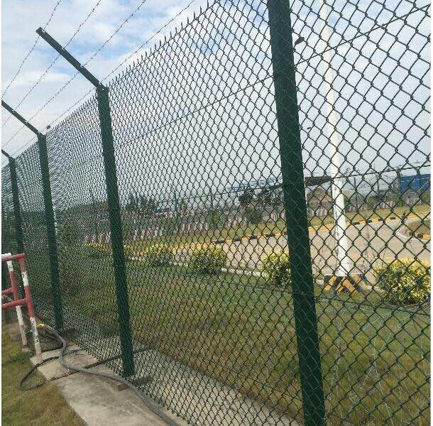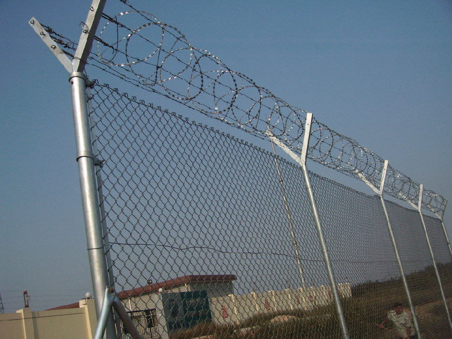 防護區(qū)周界柵欄主要由立柱、支撐、編織網(wǎng)、曲臂、刺絲、刺刀籠、系緊裝置及固定裝置等構件組成。
