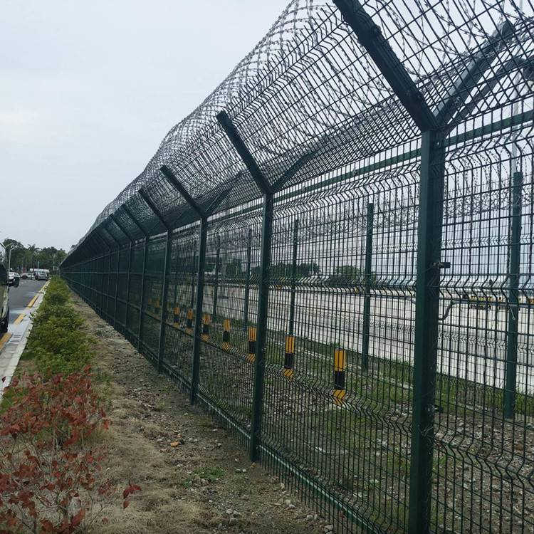 機場鋼筋網(wǎng)圍界又稱作機場圍界網(wǎng),是由V型支架立柱加強型焊接片網(wǎng) ,安全防盜連接件和熱鍍鋅刀片刺網(wǎng)組成強度和安全防御性級別很高。被廣泛應用在機場,軍事基地等高安全場所。安全防盜接頭和熱浸鍍鋅刀片或鰓繩網(wǎng)是具有較高強度和安全保護水平的柵欄網(wǎng)產(chǎn)品之一。