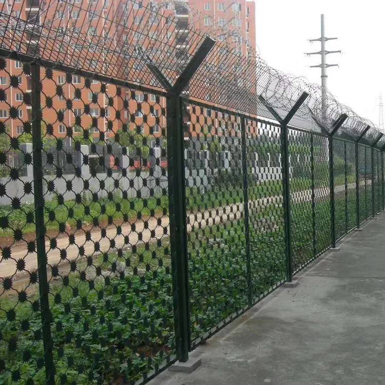 監獄梅花剌隔離網又叫沖壓刺隔離網、太陽花刺片隔離網,行業內簡稱梅花刺網。其特點為堅固牢靠、防止攀爬等。梅花剌隔離網一般用于